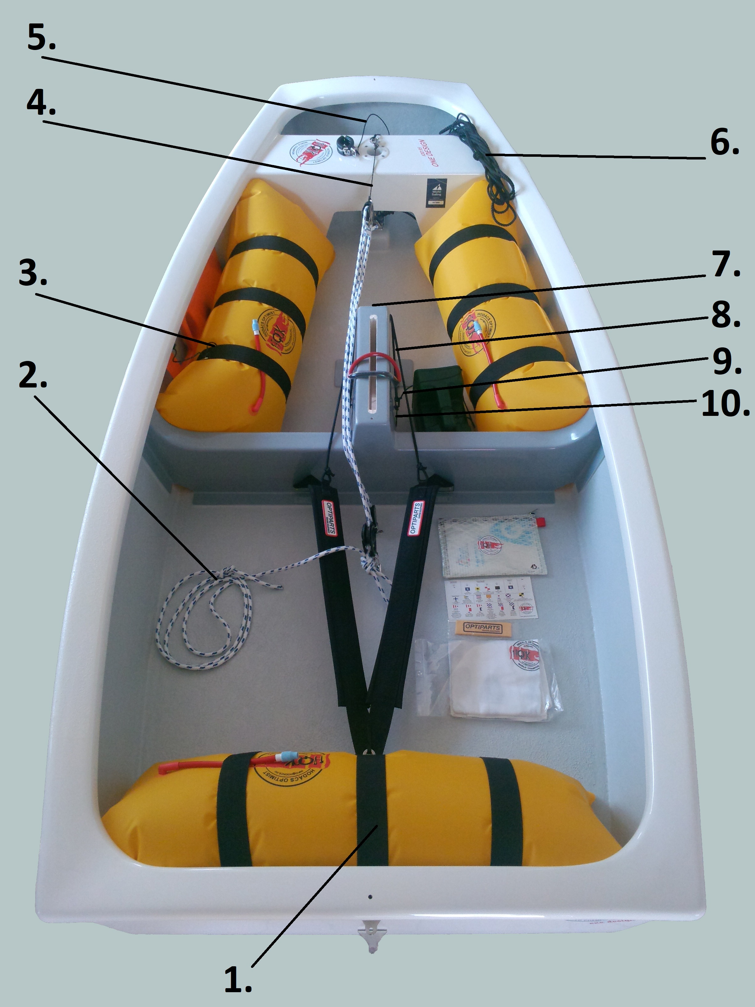 Some ropes in an Optimist are subject to class rules specifying their length, diameter, and even certain properties. Most of these requirements are in section 3.5.5 of the class rules, though other sections sometimes reference specific ropes. Is the rulebook saved on your phone?